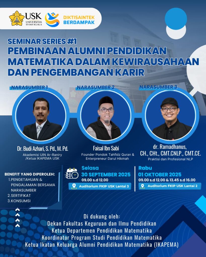 Program Studi Pendidikan Matematika (PSPM) FKIP Universitas Syiah Kuala mengajak seluruh mahasiswa dan alumni untuk berpartisipasi dalam kegiatan Seminar Series #1 bertajuk “Pembinaan Alumni Pendidikan Matematika dalam Kewirausahaan dan Pengembangan Karir”. Kegiatan ini merupakan bagian dari upaya PSPM dalam membangun ekosistem alumni yang produktif, mandiri, dan berdampak di dunia kerja maupun kewirausahaan.